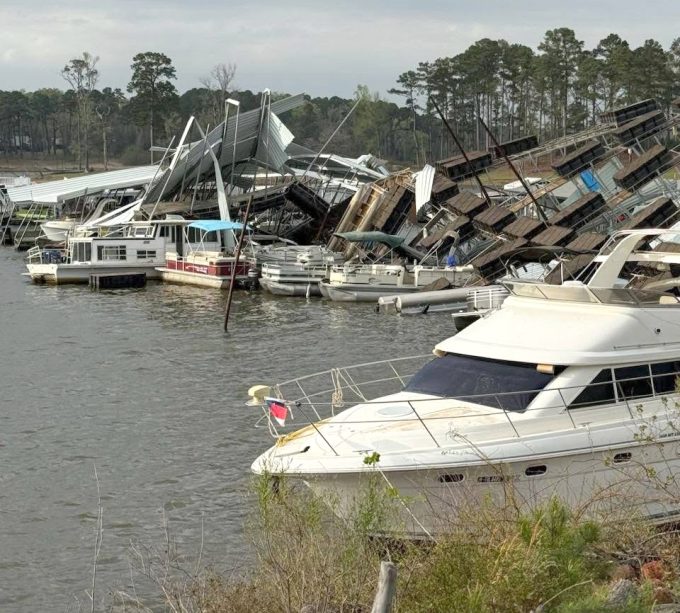 Recovery efforts are underway at Bullfrog Marina at Lake O’ the Pines after high winds demolished its main ...